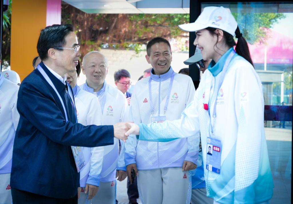 当日离程之际,程凯主席一行途经志愿者服务区域,与我校仍在岗履职的师生志愿者相逢。领队邹新貌老师向程凯主席献上“广师大志愿之星”徽章,简要介绍了我校 “小海豚” 志愿者团队概况及赛事服务开展情况,并邀请志愿者代表分享服务心得。同学们结合服务经历谈到:政府打造的无障碍场馆构筑“硬联通”,志愿者以真诚服务与温暖陪伴编织 “软联通”,与运动员并肩互勉达成 “心连通”,三者共同汇聚成残特奥会的温暖与力量。