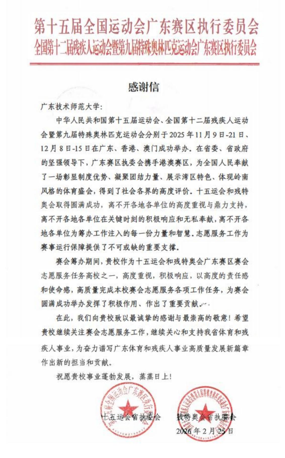 近日,第十五届全国运动会(以下简称“十五运会”)和全国第十二届残疾人运动会暨第九届特殊奥林匹克运动会(以下简称“残特奥会”)广东省执委会、残特奥会开幕式组委会、排球竞委会、盲人门球竞委会及安徽省残疾人体育训练指导中心等5家单位分别向我校发来感谢信。信中对我校6名带队教师及423名“小海豚”志愿者在赛会期间的优异表现表示衷心感谢,对我校以高度的责任感与使命感,高质量完成所承担的赛会志愿服务各项任务,为赛会圆满成功举办做出的积极贡献给予高度肯定。