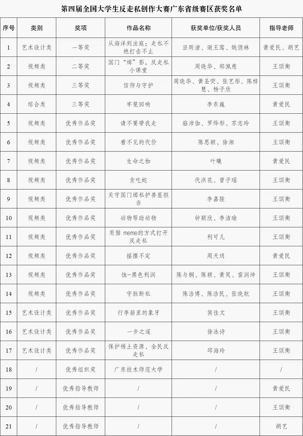近日,省学联公布第四届全国大学生反走私创作大赛广东省级赛区获奖名单,我校共有21项作品进入广东省级赛区获奖,其中一等奖1项,二等奖1项,三等奖2项,优秀奖13项,优秀指导教师奖2项,学校荣获优秀组织奖。