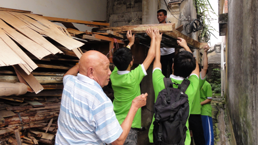 在志愿服务过程中,有位年过八旬的老爷爷向我们提出,屋子后面有一堆两米多高的废木材,风吹日晒,摇摇欲坠,他担心堆得高高的木板随时都有砸下来的危险,会危机院内的老人和小孩,由于院内住的都是老人和小孩,平日里无人能卸下这堆木材。我们的队员和龙山的学弟学妹们听了老人的叙述,一起帮他把木板搬下来,老人非常感激。