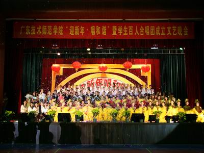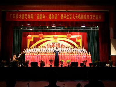12月26日晚,由院团委、工会主办的广东技术师范学院“迎新年、唱和谐”暨学生百人合唱团成立文艺晚会在校本部综合馆三楼隆重举行。学院党委书记邝邦洪在晚会上发表了新年致辞,并宣布广东技术师范学院学生百人合唱团正式成立。随后,来自学院各系师生同台献演,动听的歌声和奔放的舞蹈表达了广大师生对学院的热爱,展现了全院广大师生为构建“和谐校园”而努力奋斗的风采,为迎接新一年的来临唱响了一曲和谐之歌。