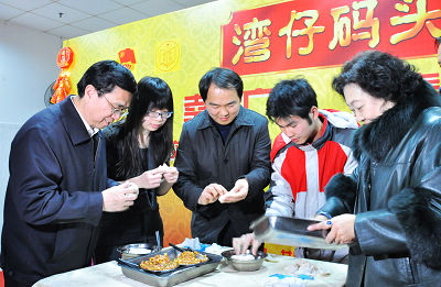 (图为团省委书记陈东、我院党委书记邝邦洪、湾仔码头创始人臧健和女士与留校学生一起包饺子)
