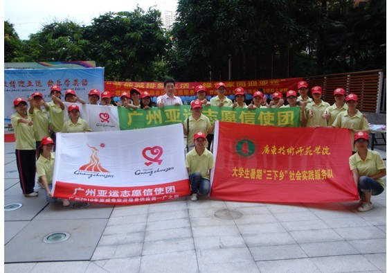 2010年7月13日下午,为引导青年学生深入学习实践科学发展观,深入贯彻落实中共中央政治局委员、广东省委书记汪洋同志“迎接亚运会,创造新生活”的号召和校党委提出的“以德为行,以学为上”的教育理念,履行大学生的社会责任,文学院的学生组织了一支以“节能减排新生活,绿色家园迎亚运”为宣传宗旨的队伍,到天河区猎德街道的凯旋新世界社区进行宣传活动。