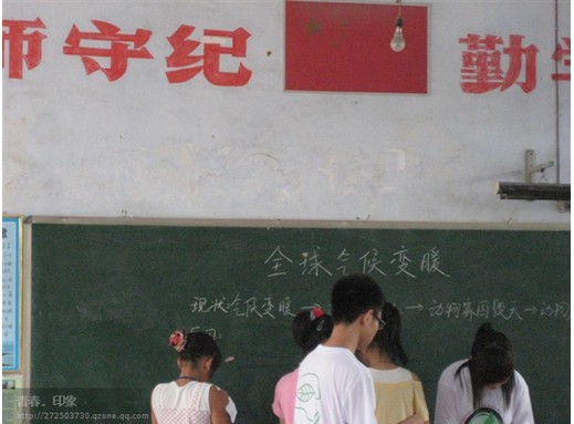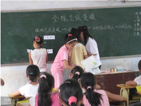7月20日,绿色环保协会赴清远——连山服务队的老师们为永和中心小学40名小学生上了一节以“全球气候变暖”为主题的环境保护教育课。在课上,老师们从地球的现状、全球气候变暖的原因和措施这三方面入手,以游戏,知识讲解,学生们自主讨论等形式让学生认识到全球气候变暖的严重性和学会在生活中做些力所能及的事来保护环境。课堂气氛非常活跃,学生们积极参与课堂的游戏和讨论。老师们在课前认真备课,在课上详细解答学生们的疑问。虽然只有短短的四十分钟,效果是明显的。作为一个高校的环保社团,做好环保教育是大家应有的责任。希望在以后的日子里,环境保护教育可以做得更好。