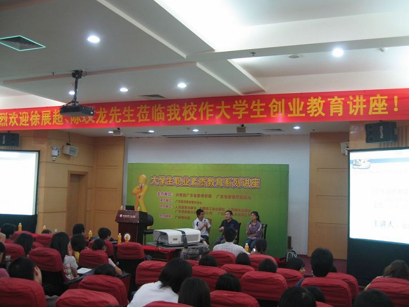 为进一步贯彻落实“以德为行,以学为上”的教育思想,帮助大学生提高职业素质,增强大学生创业能力,积累就业经验和竞争力,促进大学生成长成才,学校团委根据团省委、省教育厅的有关通知精神,举办大学生创业教育系列讲座。4月14日下午,第一讲邀请了广东普教图书发行有限公司董事长徐展超先生、资深品牌战略专家陈玟龙先生在校本部学术报告厅作了《职业化素质:职场试金石》、《CIS、品牌与职场人生》的讲座。团委负责人及各学院学生230余人参加了讲座。