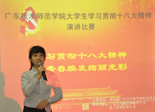 在比赛现场,选手们精神抖擞,慷慨激昂,利用图文并茂的PPT,结合学习十八大精神的心得体会,展现我院学生积极追求上进,自觉担负起新时期党和人民赋予的历史使命的精神面貌。经过紧张激烈角逐,计算机科学院朱丹年同学脱颖而出,获得一等奖,电子与信息学院李园园、音乐学院张思静获得二等奖,教育技术与传播学院伍婉秋、文学院吴叶、外国语阮真获得三等奖,其中朱丹年同学将代表学校参加由省委组织部、省委教育工委、团省委举办的广东省大学生学习贯彻十八大精神演讲比赛。(学院团委)