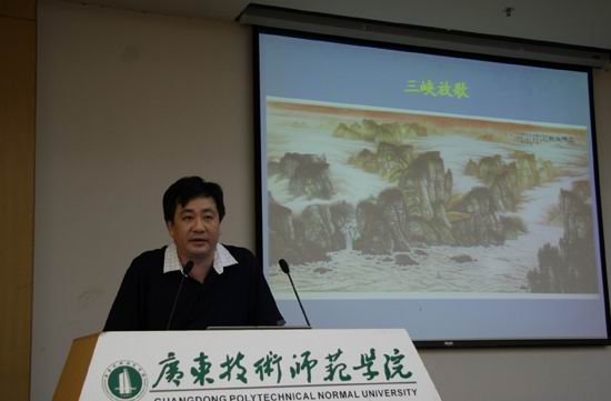 随后,陈奕纯博士为广大师生作了主题为“漫说我的书画艺术”的报告。陈奕纯博士与师生们分享了他应邀为中南海创作《三峡放歌》、《清气溢乾坤》、《阳光灿烂 春暖花开》、《盛世春光》、《和谐之春》5幅大型中国画的创作理念、过程和体会。陈博士就用富有诗意的语言带着师生们去感受这五幅作品的艺术魅力。《三峡放歌》画面明朗壮阔,朝霞漫天,旭日俯瞰着大地,将祖国的河山洒上绚丽的色彩。江山万里,辽阔无垠,汇成生命的交响,天地的强音,大地的赞歌,传递的是一种不畏艰险、勇往直前的民族精神。《清气溢乾坤》则是水波千里、超然物欲之外的白莲,表达了 “出淤泥而不染,濯清涟而不妖”,风骨高标、坚毅独树的精神。《阳光灿烂 春暖花开》画面上,强劲的树干,经历风雨,坚如磬石,像巨龙般蜿蜒在祖国辽阔的大地上;繁花覆盖处,看不见尽头,其恢弘象征着中华民族的昌盛;以挺拔的树干来统领千万朵含笑怒放的玉兰花,这使我们的视野和胸襟不再拘泥于一棵树、一幅画,而看到的是祖国辽阔的疆域上,西起江河之源,东到大海之滨,处处鲜花盛开,阳光灿烂,象征亿万人民迎着春光绽放着心中的喜悦!《盛世春光》画面上,花瓣摇曳,你中有我、我中有你,相互渗透、相互浸染,百花盛开、瑞鸟飞翔,仿佛天然的音乐在自然界交响奏鸣;花的风姿和动态之美,就是花变幻出的旋律之美,彰显了我们伟大祖国的繁华盛世。《和谐之春》牡丹图,则是展示出56个民族的当代风采,昭示一个大国的千年辉煌。这些作品凝结着陈奕纯博士对祖国美好河山的赞美之情,洋溢着对祖国取得巨大成就的热情歌颂,也寄寓着陈奕纯博士对祖国明天更辉煌的憧憬。