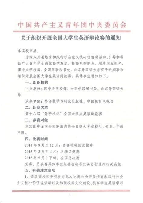 为深入开展培育和践行社会主义核心价值观活动,引导和帮助广大青年学生强化勤学意识、提高明辨能力、培养国际眼光,团中央学校部、全国学联秘书处、北京外国语大学将于近期联合组织开展全国大学生英语辩论赛。具体事宜通知如下。