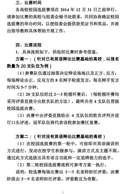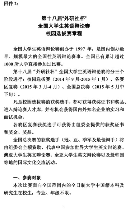 2.校园选拔赛统一冠名为“第十八届‘外研社杯’全国大学生英语辩论赛××大学选拔赛”。