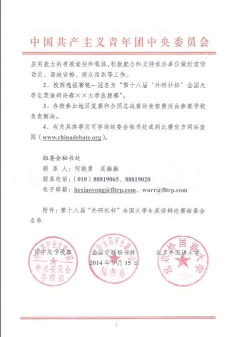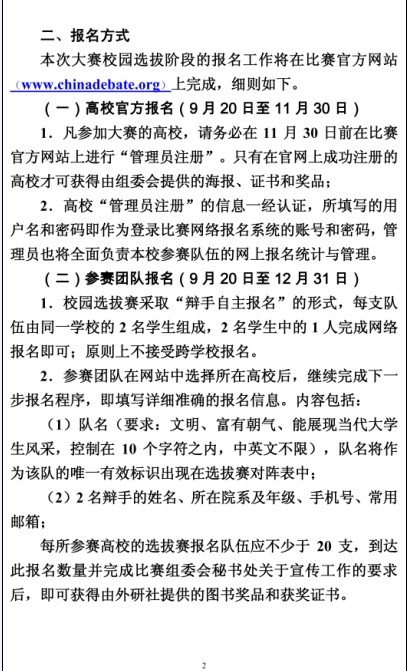 4.有关具体事宜可咨询组委会秘书处或到比赛官方网站查阅(www.chinadebate.org)。