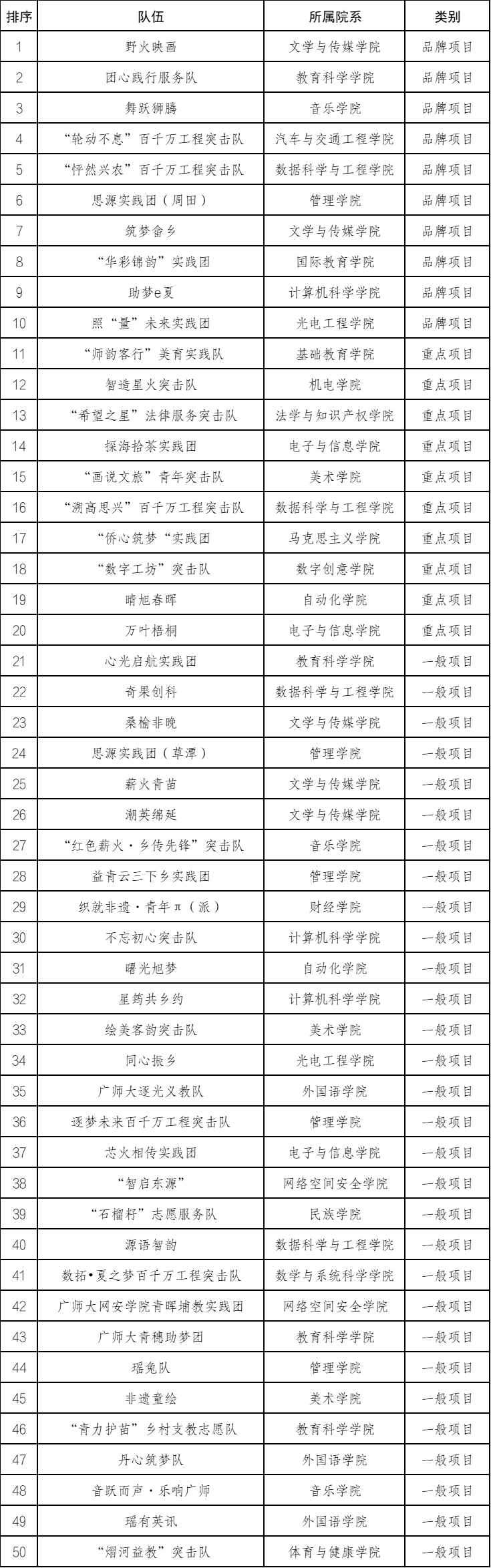 根据《关于开展2025年广东技术师范大学大学生志愿者暑期文化科技卫生“三下乡”社会实践活动暨广东青年大学生“百千万工程” 突击队行动活动总结暨优秀评比工作的通知》,经专家评审,拟确定“野火映画”突击队等10个项目为品牌项目,“师韵客行”美育实践队等10个项目为重点项目,心光启航实践团等30个项目为一般项目,现予以公示: